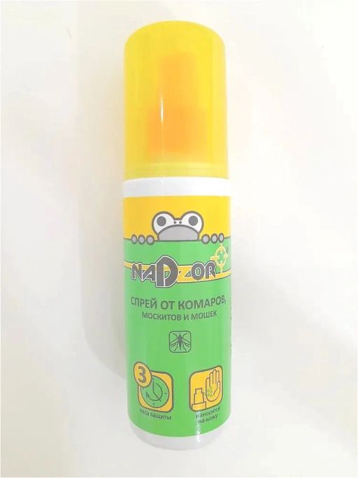 Внешний вид товара может отличаться от фотографий на сайте. Спрей Nadzor подходит как взрослым так и детям от 2х лет. Отлично защищает от летающих кровососущих насекомых (комаров, мокрецов, мошек и москитов) Наносится на открытые части тела и одежду. Время защитного действия при нанесении на кожу до 3х часов, при нанесении на одежду до 3х суток. Не применять детям до 2х лет, беременным и кормящим женщинам. Избегать попадания средства на пластик и лакированные поверхности.