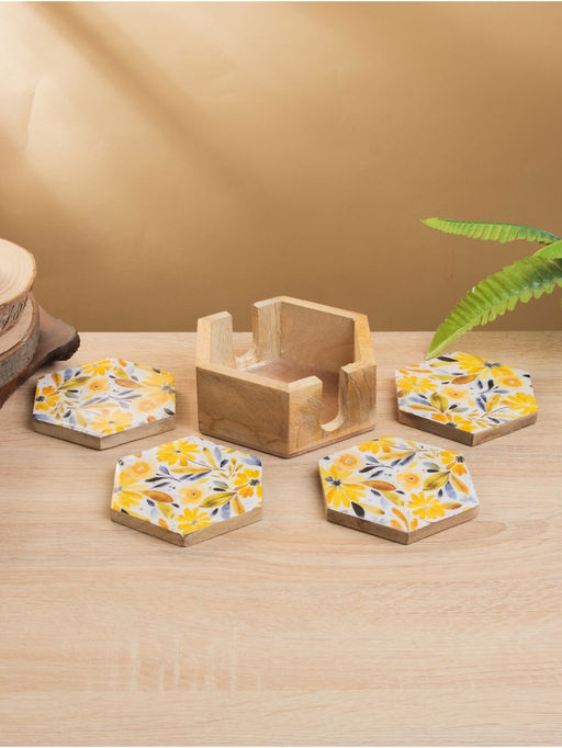 Подставка под горячее «Желтые и синие цветы», набор 4 шт., 15×13×5 см, дерево манго