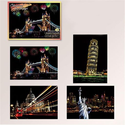 В набор входит 4 скретч-открытки с нанесенным изображением и деревянная ручка-перо для "процарапывания защитного слоя"­