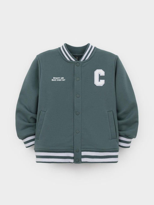 Бомбер с контрастными рукавами для мальчика. Изготовлен из мягкого петельчатого трикотажа. Застёгивается на кнопки. Воротник, манжеты и пояс - вязаные. Спереди карманы с листочкой.. Состав: 80% хлопок, 20% полиэстер
