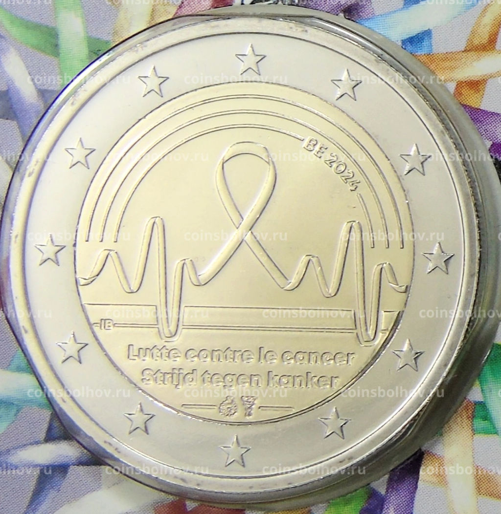 Монета 2 евро 2024 года Бельгия Борьба с раком в Бельгии(текст на лицевой стороне блистера на фламандском и английском)