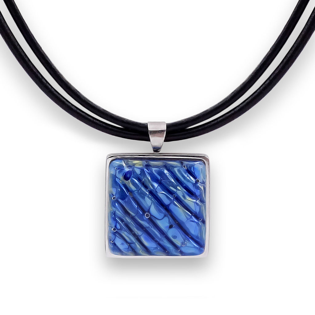 Колье изготовлено из натуральной кожи, муранского стекла и гипоаллергенной ювелирной стали, что очень важно для людей с чувствительной кожей. Металл не темнеет и не подвергается воздействиям окружающей среды, надолго обеспечивая красивый внешний вид изделия. Длина колье - 46 см + 5 см. удлиняющая цепочка. Длина кулона - 8 см. Размер стеклянного элемента - 3х3 см. Вес - 20  гр.­