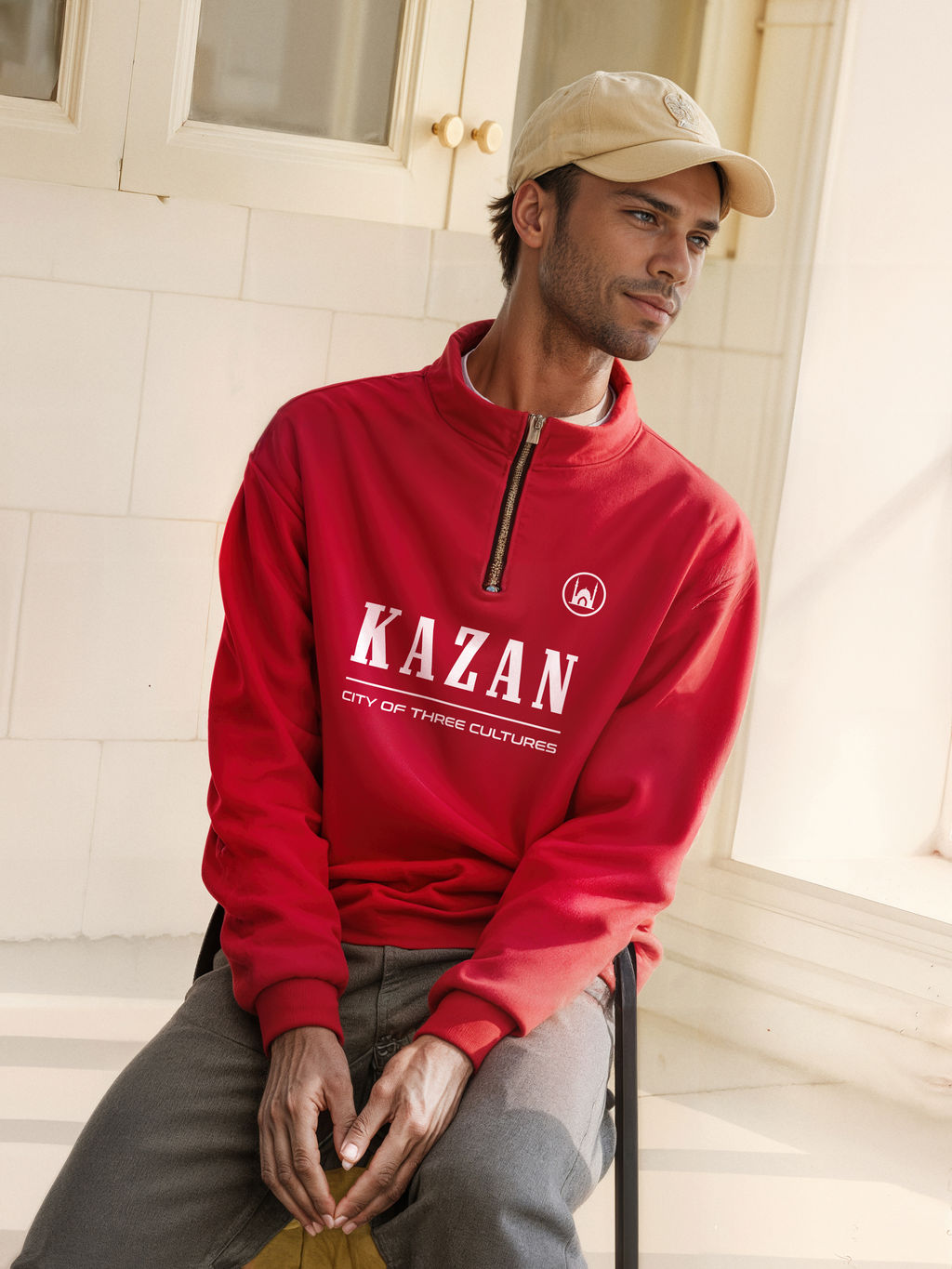 На груди расположен крупный принт KAZAN и надпись City of Three Cultures, а также минималистичный графический элемент с силуэтом мечети "Кул Шариф".