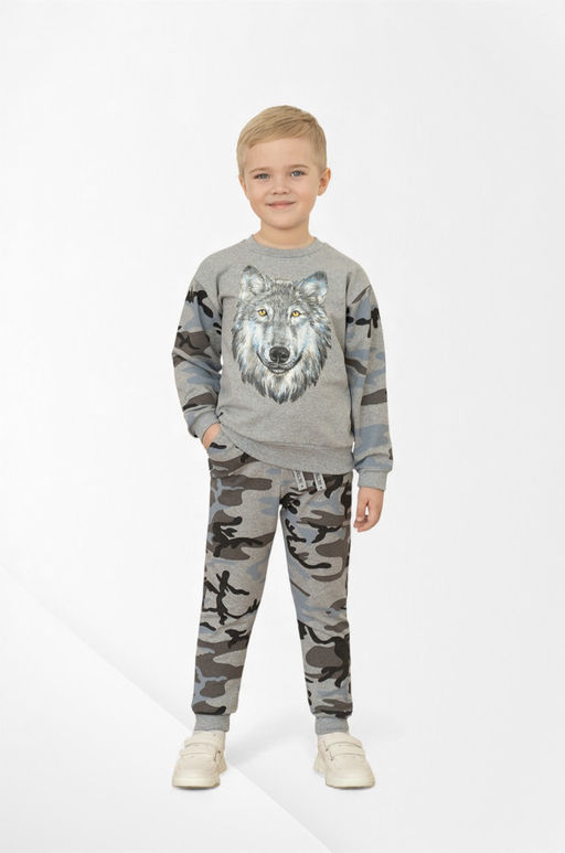Детский костюм из футера с лайкрой комбинированного однотонного меланжевого и серого камуфляжного цветов. Свитшот с однотонной полочкой и спинкой. Спереди большой красивый принт. Штаны на поясе с резинкой камуфляжного цвета, с дополнительным шнурком для лучшей посадки. По низу рукавов и штанин мягкие эластичные манжеты. Материал, из которого сшит костюм, устойчив к вытягиванию и образованию катышков. Дизайн костюма подходит и мальчикам и девочкам.