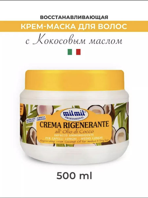 Крем-маска для волос восстанавливающая с кокосовым маслом Mil Mil, 500 мл - профессиональная итальянская маска, разработанная специально для того, чтобы восстановить и укрепить Ваши волосы, придав им неповторимый блеск и шелковистость.