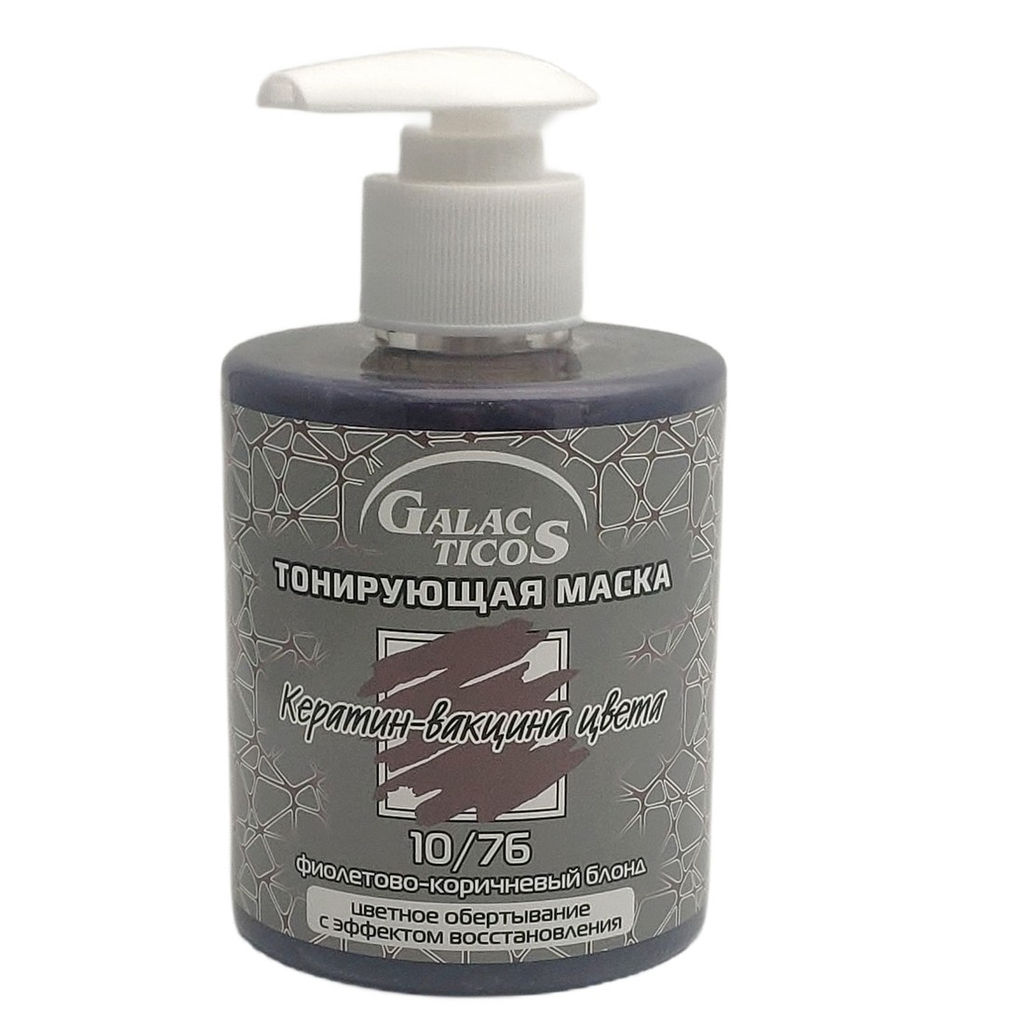 Описание товара Galacticos тонирующая маска кератин-вакцина цвета 10/76 фиолетово-коричневый блонд 320 мл Тонирующая маска кератин вакцина цвета цветное обертывание с эффектом восстановления. Тонирующая маска предназначена для освежения цвета и восстановления структуры волос на основе кератина и глюконамида с авангардным кондиционирующим комплексом. Маска незаменима для обновления цвета между окрашиваниями для придания нового цветового нюанса и усиления существующего оттенка волос Коррекция цвета происходит на клеточном уровне кутикулы волоса пигментами, находящимися внутри нанокапсул. Насыщенная тонами палитра позволяет попробовать новый образ, не прибегая к окрашиванию окислительными красками. Для ярких индивидуалистов, вдохновленных креативными идеями, в серию входит база 0.0, база без добавления пигментов для восстановления волос или создания новых оттенков, позволяющая получить прозрачные акварельные тона. особо актуальные в наши дни. Маска тонирующая для оживления цвета и восстановления структуры волос работает на уровне тона не ниже 8. В основе маски инновационный ингредиент на базе глюконамида, проникающий в кортекс создает новые связи, делая пряди сильными изнутри. Инновационный кондиционирующий комплекс, в свою очередь создает на поверхности волоса воздухопроницаемую пленку, которая предотвращает потерю цвета и агрессивное воздействие внешних факторов.