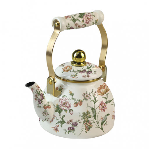 Эмалированный чайник объёмом 1,3 литра изготовлен из эмалированной стали и оснащён съёмным фильтром из нержавеющей стали. Комбинированная ручка выполнена в стиле под золото, а внутреннее эмалированное покрытие придаёт чайнику стильный вид. Ручка на крышке украшена декоративными элементами, а наружное покрытие выполнено в виде эмалированного рисунка.