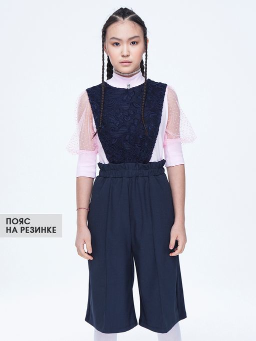 Комбинезон для девочки из комбинации трикотажного полотна, текстиля и кружевного полотна. Шорты широкие, с высокой талией, с карманами в боковых швах. Передние и задние половинки из разнофактурных полотен. Пояс широкий с "гребешком", с эластичной тесьмой внутри. Перед двухслойный, переходит в бретели на спинке. Состав:20% виск, 37% п/э, 40% х/б, 3% эл