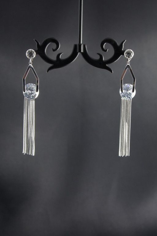 Длинные сережки - гвоздики подчеркнут стройность шеи, колышутся и мерцают при ходьбе, привлекая внимание к их владелице. Серьги выполнены из металла серебряного цвета, украшены прозрачными цирконами.