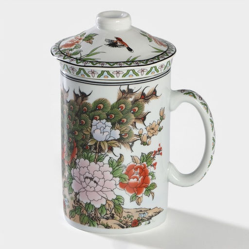 Кружка Цветы изготовлена из качественной керамики. Изделие дополняет керамическое сито для заваривания и крышка, благодаря которой напиток будет дольше сохранять тепло. Кружка украшена изящным восточным рисунком.