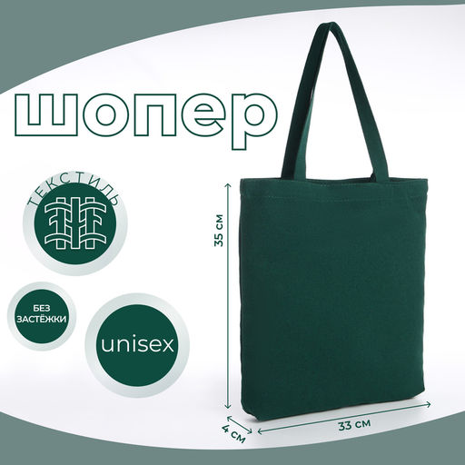 Сумка текстильная шопер без застёжки, 33×4×35 см, однотонная, зелёная