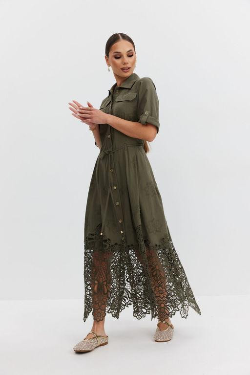 Платье из ажурной хлопковой ткани. Длина макси. Застежка на петли и пуговицы. Платье отрезное по талии. Воротник рубашечный. По переду накладные карманы с клапаном. Рукав прямой ? с регулируемой патой. По юбке платья складки. В боковых швах карманы. В комплекте съемный пояс-завязка. Юбка платья на хлопковой подкладке.