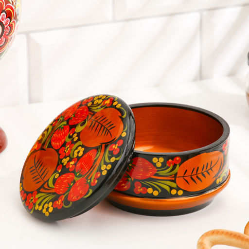Хохлома — один из старейших русских народных промыслов. Любима она и сегодня за свои неповторимые узоры и гармоничное цветовое сочетание. Основные краски, применяемые в хохломской росписи, относятся к тёплой гамме спектра: красный, чёрный, золотой.Сочетание этих цветов, пришедших из иконописи, очень символично:Красный (красивый) — цвет власти;Золотой — цвет поиска, благополучия, божественного начала;Чёрный — цвет занавеси перед вечной жизнью, цвет духовного очищения.Традиционные элементы Хохломы — ягоды рябины и земляники, цветы и листья, птицы, рыбы и звери.Расписывают изделия вручную, без предварительной разметки, благодаря этому каждое изделие уникально, и рисунок каждый раз отличается от предыдущего. Набор: Нет. Форма: Круглая. Длина, см: 13. Ширина, см: 13. Высота, см: 7. Тематика: Цветочно-растительная. Тематика: Ягоды. Тематика праздника: Универсальная тематика. Тематика праздника: 8 Марта. Вид дерева: МДФ. Покрытие: Лак. Деления внутри шкатулки: Нет. Бесплатная доставка: Да. Размеры товара: 13/13/9. Примечание: Ручная работа. Рисунок и размеры могут незначительно отличаться..
