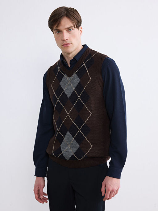 • V Yaka Baklava Desenli Erkek Triko Kazak