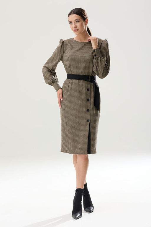 Состав: Вискоза-33%; ПЭ-64%; Эластан-3%; Восхитительное платье на любой случай! Платье отрезное по линии талии. Лиф с нагрудными и талиевыми вытачками. На спинке-талиевые вытачки, которые делают силуэт изящнее. По линии талии, для балансирования размерного объема, в шов вставлена эластичная тесьма (резинка, шириной 1 см). Горловина округлой формы. По окату и низу рукава-сборка. Рукав втачной, одношовный, длиной 64,5 см на манжете, высотой 8 см и застежкой на петли-пуговицы. Нижняя часть платья-прямого силуэта, чуть зауженная к низу. По линии талии также расположены талиевые вытачки. Конструктивная деталь - смещенный разрез с контрастными планками на пуговицах, разрез функциональный. В среднем шве спинки расположена застежка - потайная молния. Длина платья по спинке 105 см. Длина юбки платья от талии 66 см. Платье дополняет съемный текстильный, контрастного тона (черного) пояс на пряжке. *фурнитура может отличаться от представленной на рекламном фотоматериале Особые рекомендации: рекомендуется холодная деликатная ручная стирка, без использования отбеливающих СМС, без интенсивного трения. Сушка в вертикальном положении. ВТО с минимальным паром. -- Характеристики -- Состав: Вискоза-33%; ПЭ-64%; Эластан-3%; Сезон: Осень-Зима Рост: 164 Страна бренда: Беларусь