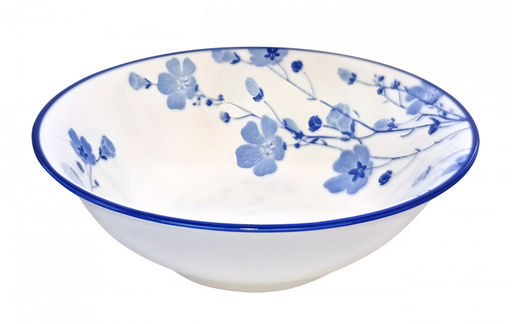 Миска суповая из коллекции фарфоровой посуды "Синяя вуаль". На изделии изображены голубые цветы и веточки. Диаметр изделия 18 см, высота 5.7 см, литраж 600 мл. Можно использовать в качестве суповой тарелки или салатника. Миску можно использовать в посудомоечной машине и СВЧ. Сделано в Китае.