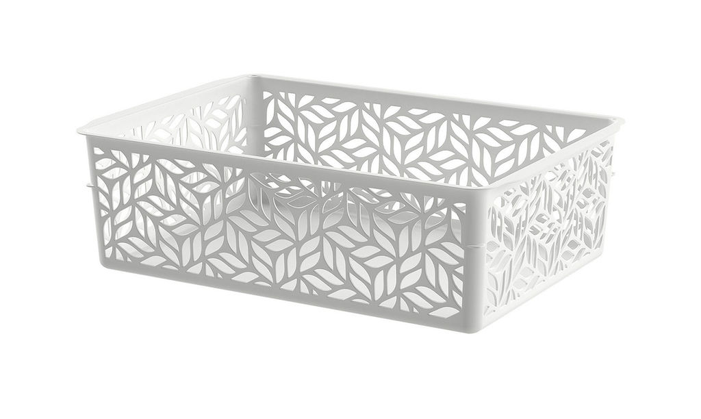 Корзинка позволит организовать хранение на любой поверхности вашего дома и в каждой комнате. Выступающий увеличенный кантик корзинки по верхнему краю удобен для её переноски. Благодаря ажурному узору из листочков корзинка выглядит лёгкой и гармонично впишется в любое окружение. Корзинка среднего размера подойдёт для небольших предметов, например, канцелярских товаров, косметики, аксессуаров для готовки, банок со специями, небольших детских игрушек и многого другого.­