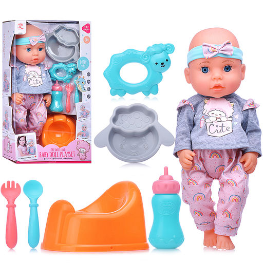 • В комплекте: бутылочка, горшок, тарелка, вилка, ложка, погремушка.