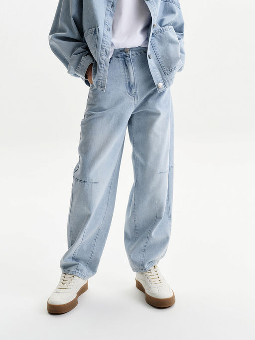 Новинка, джинсы из плотного денима. Барелли, нового силуэта, пояс на резинке. Боковые карманы переда. Имитация гульфика.На уровне колена заложены вытачки по переду и по спинке, и дополнительные наклонные вертикальные вытачки от низа брюк, по преду и по спинке. По спинке кокетка, и накладные карманы. Пояс с внутренней утяжкой на шнурок. Джинсы barrel (или бочонки) это фасон свободного кроя, характеризующийся широкими штанинами в бедрах, которые постепенно сужаются к низу, напоминая