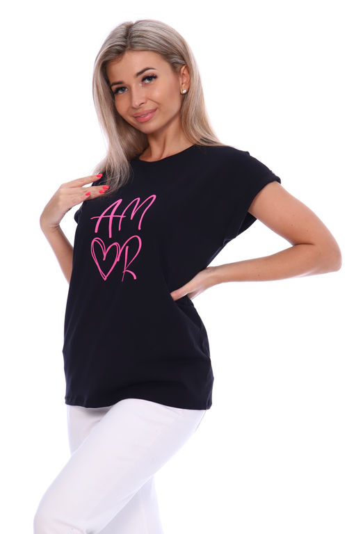 Футболка женская с оригинальным принтом, из хлопковой ткани с лайкрой. Ткань держит форму, не вытягивается, приятная на ощупь. Стильная футболка классического фасона со спущенным рукавом. Посадка свободная. Такая модель подойдет абсолютно всем и станет необходимой вещью в вашем гардеробе.