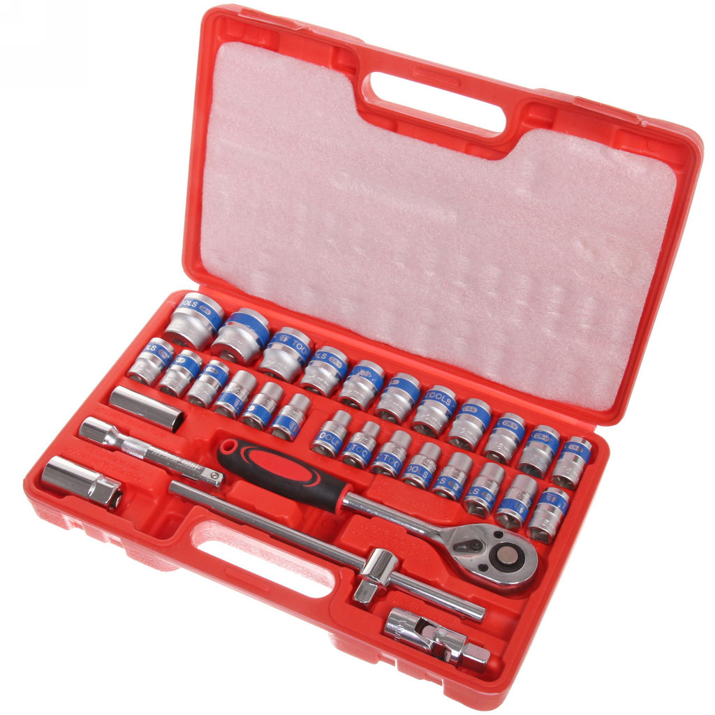 Головки торцевые шестигранные 32, 30, 27, 24, 22, 21, 20, 19, 18, 17, 16, 15, 15, 14, 13, 12, 11, 10, 9, 8мм, Головки торцевые шестигранные удлинённые 16, 21мм, Головки торцевые Torx 19, 17, 15, 14, 12, 10мм, вороток Т-образный, ключ трещоточный, Карданный шарнир, Удлинитель 125 мм, пластиковый чемодан