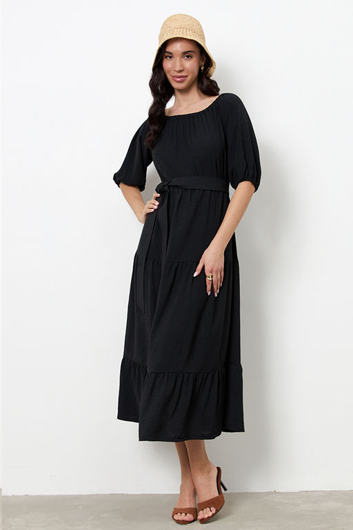 Платье свободного силуэта из ткани с крэш-эффектом, отрезное по линии талии. Нижняя части платья с воланами. Рукав-реглан до локтя. По низу рукава сборка на резину. Линия плеча и линия горловина оформлены сборкой на резину. В комплекте пояс из основной ткани.