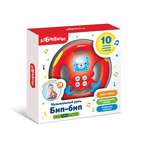 • Руль музыкальный АЗБУКВАРИК "Бип-бип" (2331, 4630027294487) красный, 10 песенок, мелодий, звуков