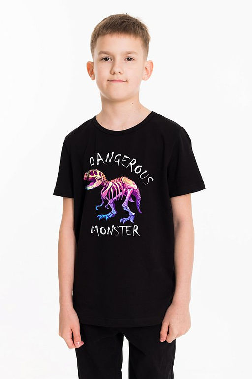 ВНИМАНИЕ: Изображение иллюстрирует модель товара. Фактический цвет указан в названии и может отличаться от представленного на фото. Футболка детская из хлопкового полотна с круглым вырезом горловины и принтом спереди.