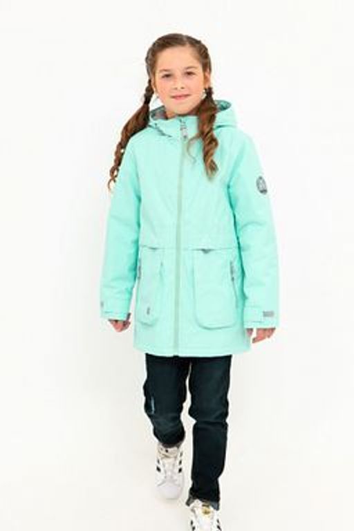 Куртка для девочек младшего школьного возраста из мембранной ткани. Центральная застежка на молнию. Комбинированная подкладка из цветного флиса и шелка с внутренним карманом на липучке. Втачной капюшон с подкладкой из цветного флиса. 2 нижних кармана с молнией. Кулиса по линии талии. На куртке расположены светоотражающие элементы. Рассчитана на температуру от -5 до +10.