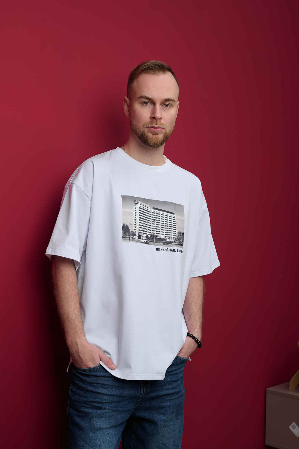 Футболка унисекс в стиле оверсайз из серии "Архитектура", на груди изображено здание гостиницы "Юбилейная".