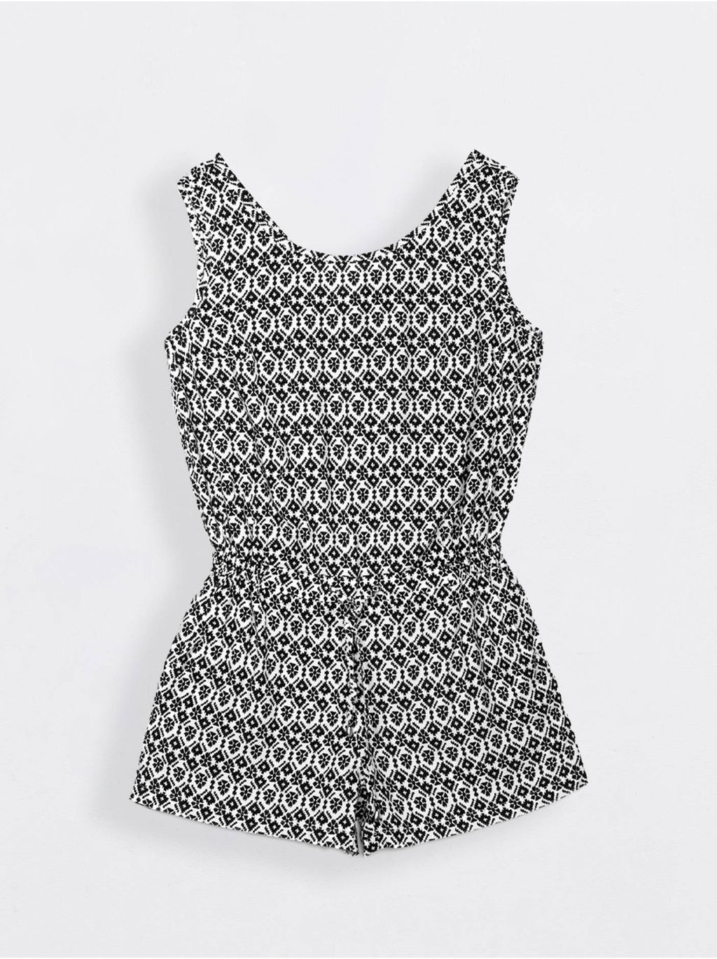 Комбинезон женский из набивного текстильного материала свободного покроя. Низ комбинезона - шорты с боковыми наклонными карманами. Верх комбинезона - блуза без рукавов. Пояс изделия с резинкой по бокам и узкими завязками вставленными по-переду в люверсы.­