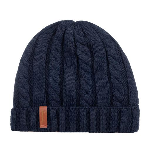 Вязаная шапка бини EDMOND 055 от Herman. Модель с косами и отворотом, связанном резинкой, выполнена из темно-синей акриловой пряжи и дополнена коричневым ярлычком с названием бренда.