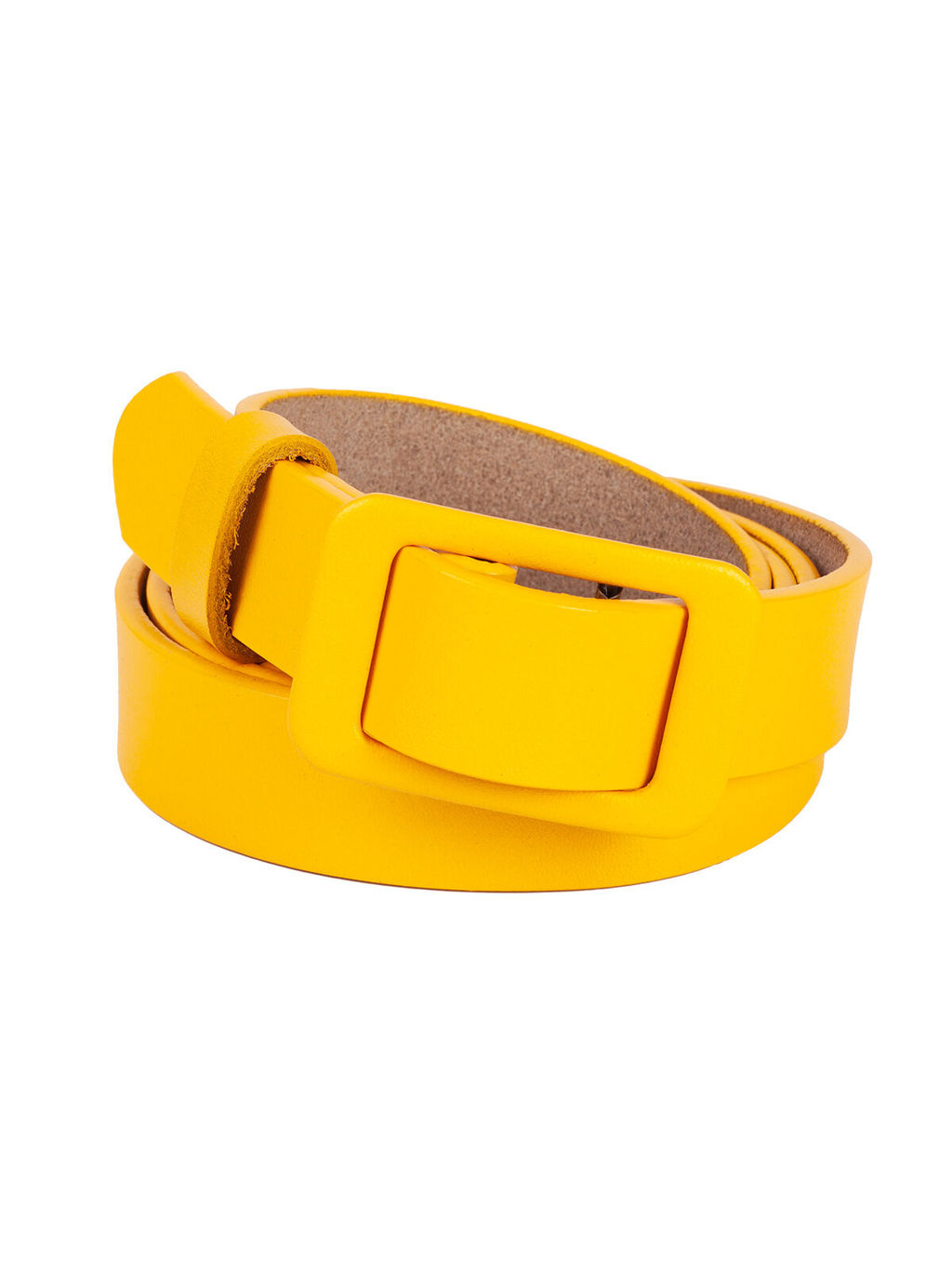 Яркий ремень желтого цвета из высококачественной кожи, с пряжкой в цвет изделия подчеркнет достоинства фигуры и станет ключевым акцентом всего образа в целом. Неширокие модели, призванны подчеркнуть тонкую талию обладательницы. Прекрасно комбинируются с жакетами, рубашками свободного кроя, платьями, кардиганами. Очень эффектно такой ремень смотрится с платьями из легких тканей.