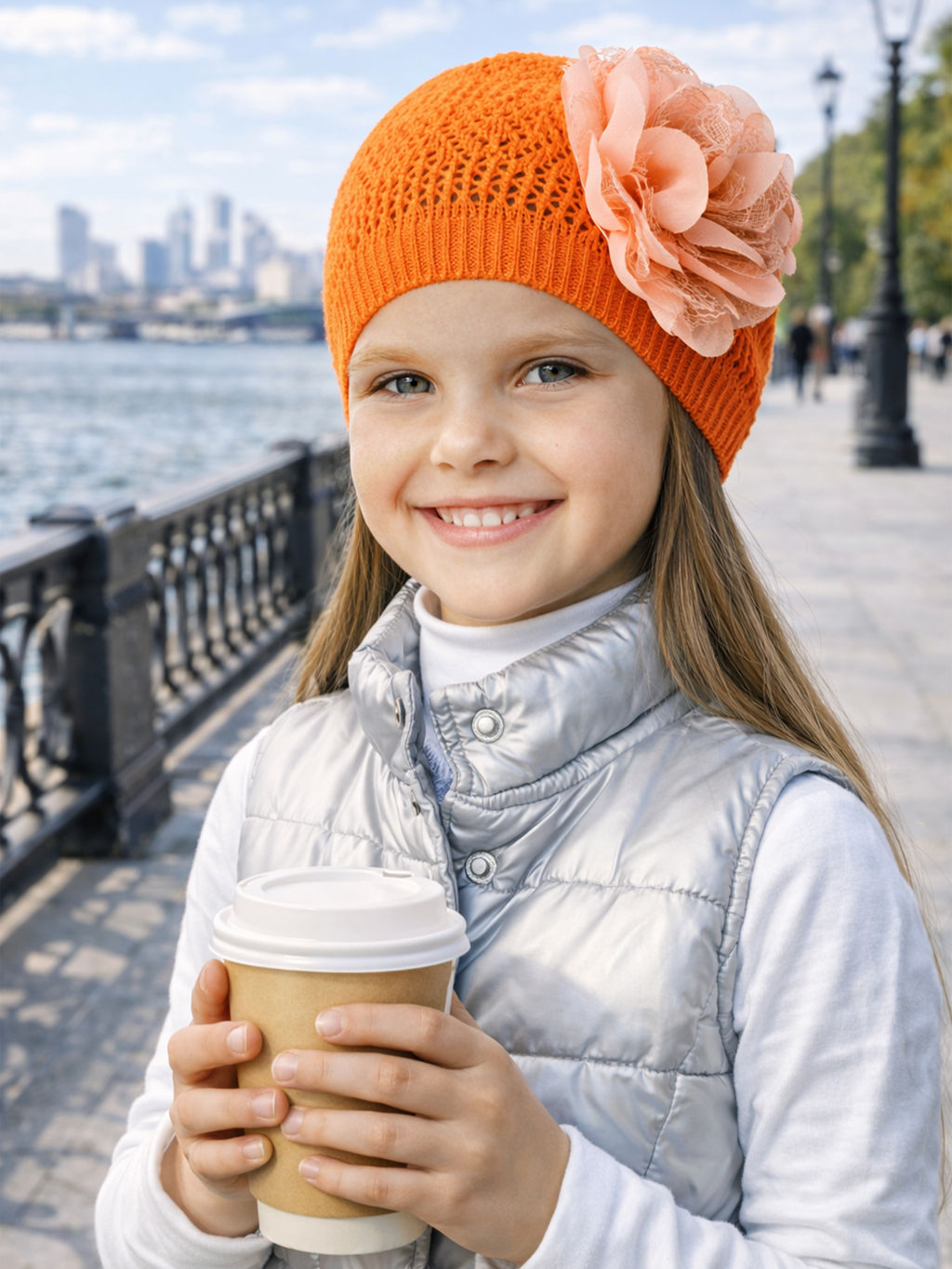 Легкая вязаная шапочка для девочки однотонного цвета на лето. Сделана из легкого акрила воздушным ажурным узором. Сбоку большой фактурный цветок контрастного цвета.