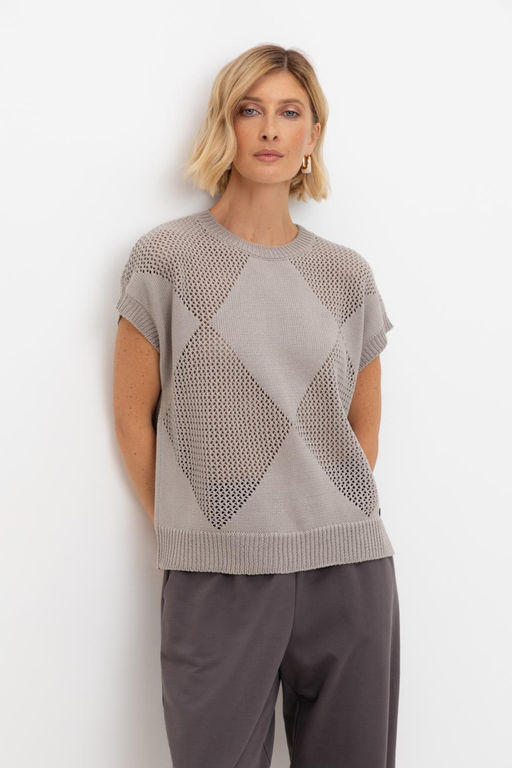 Джемпер со спущенным плечом ажурной вязки из итальянского хлопка. Умеренное переплетение, хлопок в составе придают изделию форму и ощущение комфорта во время носки. Незаменим в повседневном летнем гардеробе.. Состав: 50% хлопок, 50% акрил