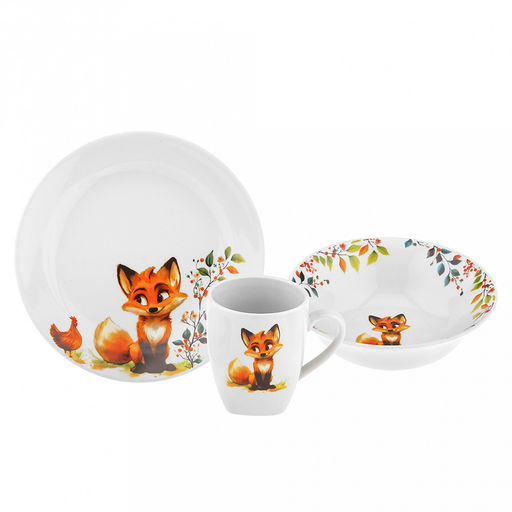 • Набор посуды фарфоровый "Лисичка" 3 предмета: тарелка мелкая д175мм гладкий край, салатник д360мм, кружка 210мл, форма "Глория", подарочная упаковка (Россия)