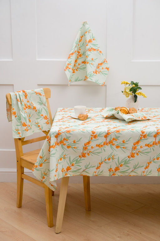 Дополненая веточками облепихи, эта скатерть не только защитит ваш стол, но и добавит нотку природной красоты в вашу кухню. Ее практичность и прочность делают ее идеальным выбором для повседневного использования.