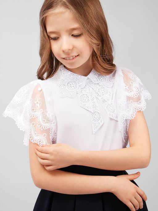Блузка для девочки Соль&Перец. Передняя часть декорирована кружевом, отложной воротник выполнен из кружева, рукава-крылышки выполнены из лёгкого фатина. Мягкий, приятный к телу материал, обеспечит идеальную посадку изделия по фигуре. Прекрасный выбор для создания красивого школьного образа.
