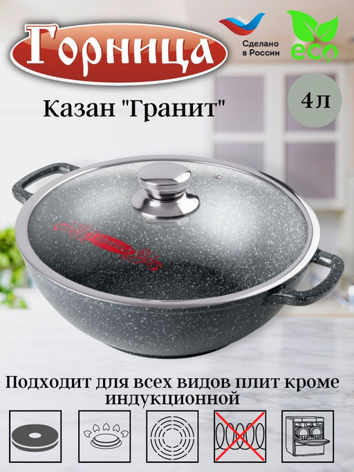 Казаны с цельнолитыми ручками можно использовать в духовом шкафу. Гранит. Коллекция посуды с улучшенным четырёхслойным антипригарным покрытием. Дополнительный слой с мраморным эффектом увеличивает износостойкость и создаёт оригинальный оттенок чёрного мрамора.