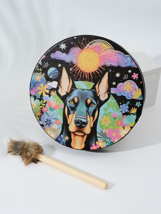 Шаманский бубен Доберман в цветах, музыкальный инструмент, с колотушкой, 5?25?25 см