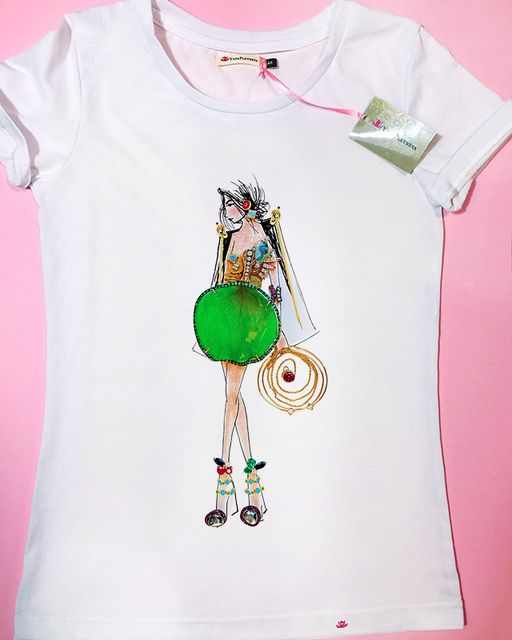 Каждый кристалл приклеивается вручную, что подтверждает прохождение 3-го этап контроля качества футболки и отсутствия производственного брака.