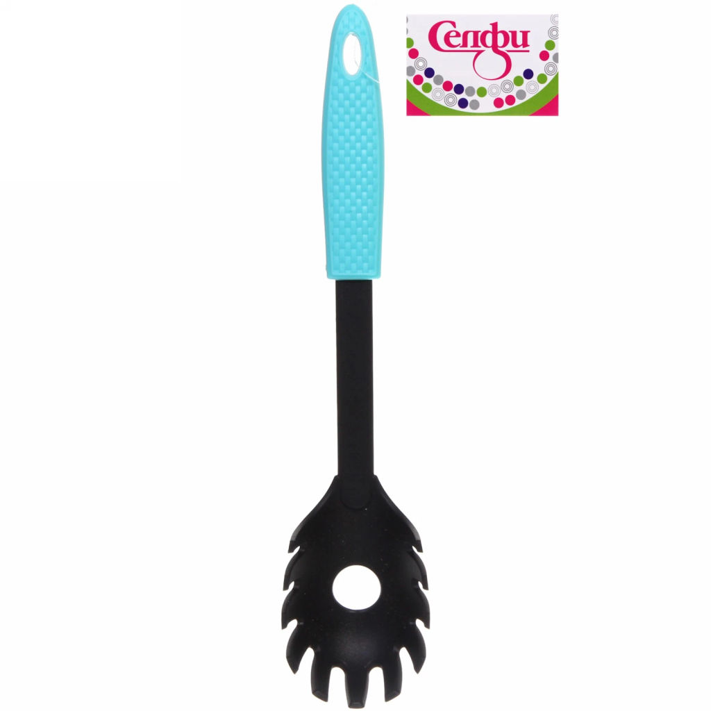 Ложка с зубчатыми краями, созданная специально для того, чтобы перемешивать и доставать из кастрюли готовые спагетти. Обычной ложкой достать спагетти из кастрюли  практически невозможно, тем более невозможно достать нужное их количество. Изделие изготовлено из высококачественного пластика, который не боится высокой температуры и не впитывает запахи.  Отверстие в верхней части ручки позволяет хранить ложку в подвешенном состоянии. На нашем сайте можно купить оптом ложки для спагетти, с доставкой по России.­