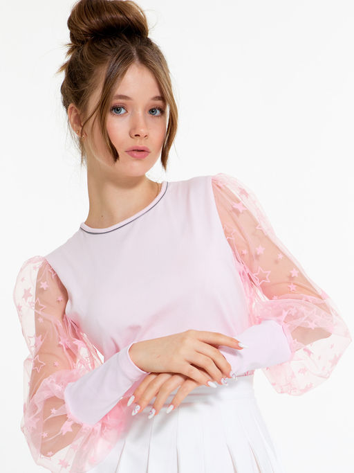 Блузка из кулирной глади с лайкрой прилегающего силуэта, длинный рукав на широкой манжете, круглая горловина.Рукава пышные из прозрачного сетчатого полотна с принтом флок. Состав:72% х/б, 20% п/э, 8% лайкра