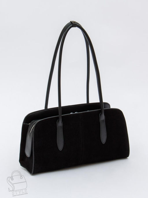 Базовая сумка на каждый день выполнена из натуральной замши. Дополнена серебристой фурнитурой. Основной отдел закрывается на молнию. Сумка носится на плече за удлинённые ручки или через плечо. Каркас полужёсткий.
