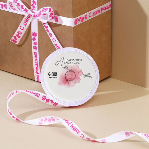 • Лента атласная, подарочная упаковка, «С днем рождения!», белая, 1 см х 5 м