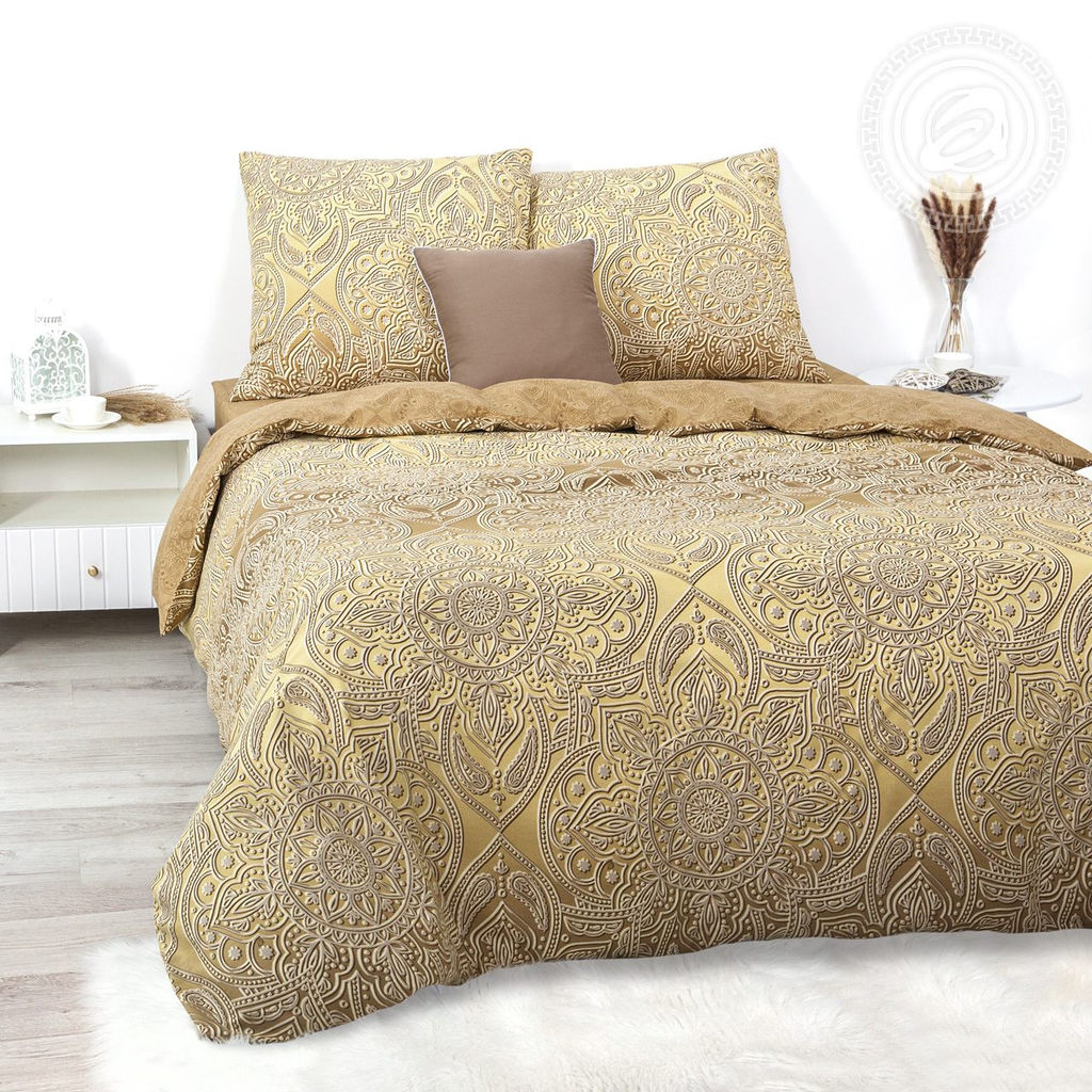 Императрица образ роскоши и величия. Для постельного белья из поплина выбрана необычная дизайнерская концепция. Золотые переливы, градиентные переходы, изящные и утонченные узоры, всё это делает комплект ярким, эффектным, стильным. Изысканное украшение королевской спальни!