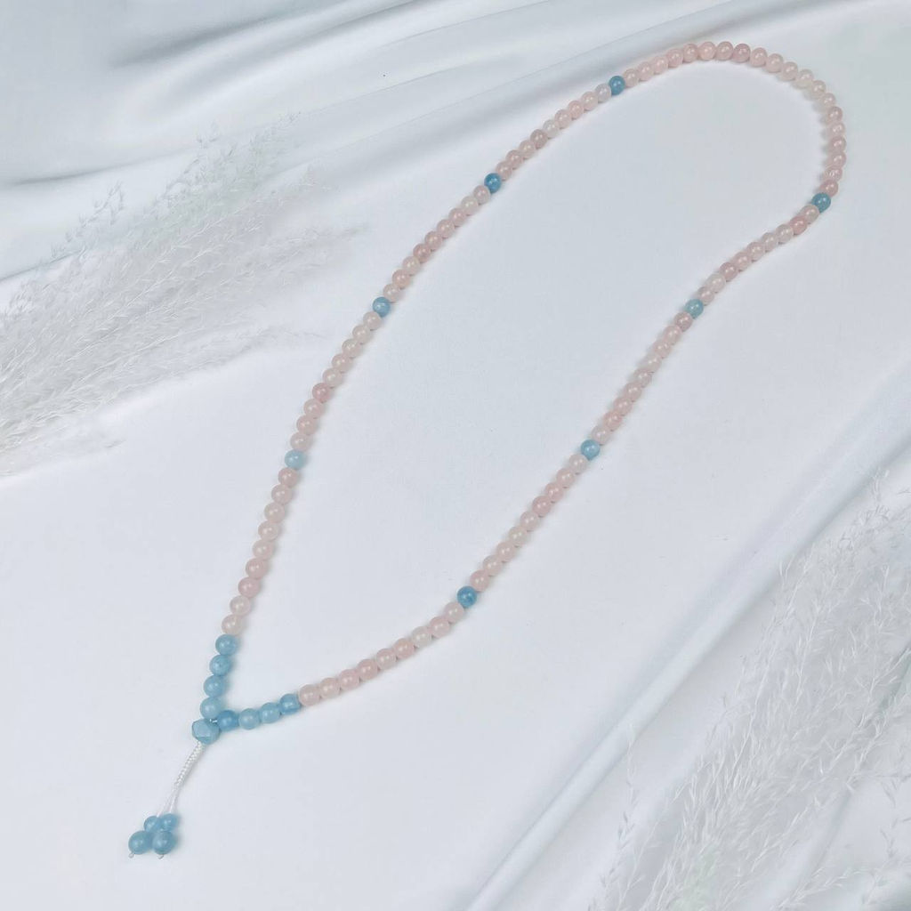 Четки буддийские "мала" из мадагаскарского Розового кварца и Аквамарина (108 бусин)