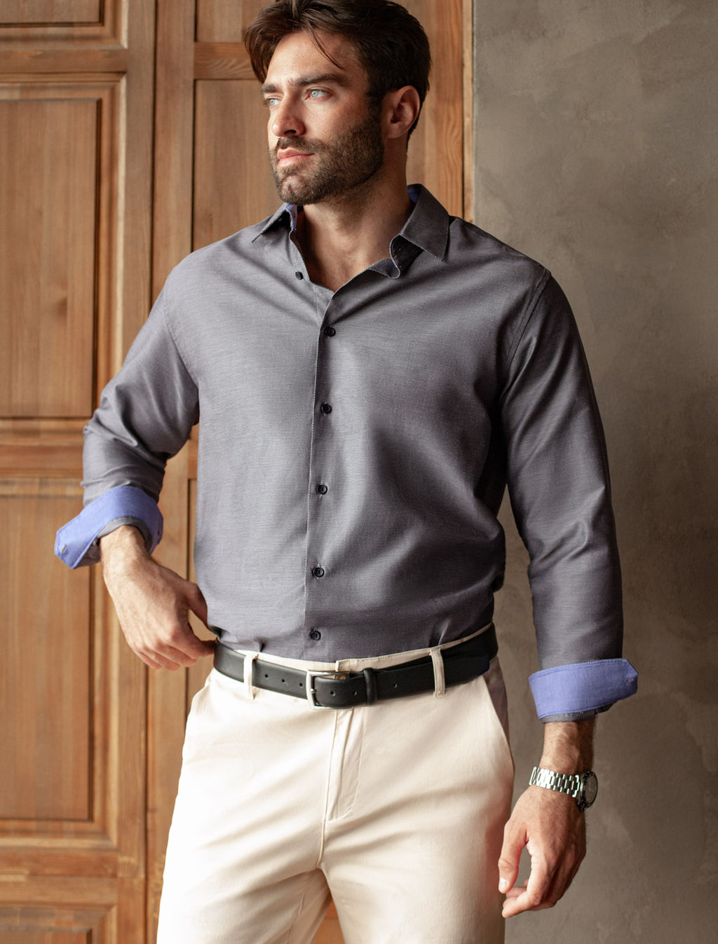 • Рубашка мужская с контрастными внутренними элементами из фактурного хлопка с ПЭ