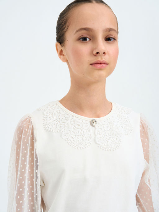 Блуза для девочки прилегающего силуэта с длинными втачными рукавами из сетчатого полотна. Горловина круглая с кружевным воротничком, рукава пышные с крупными складками по окату. Состав:72% х/б, 20% п/э, 8% лайкра