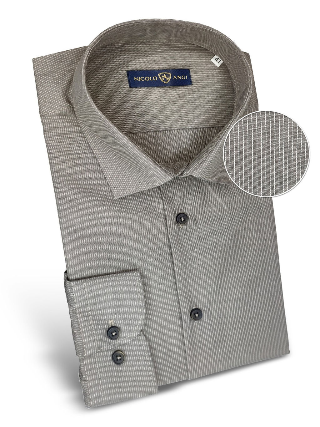 Классическая сорочка полуприталенного силуэта (regular fit) серо-коричневого цвета с длинным рукавом. Актуальная классическая мелкая полоска
